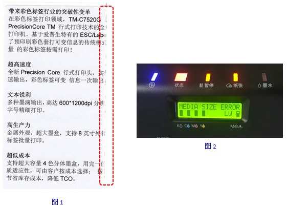 The content on the right side of the label output by the printer exceeds the boundary of the label and is printed onto the backing paper, and may even be missing,As shown in Figure 1.And the printer will report an error, the panel will prompt "MEDIA SIZE ERROR", and the status indicator light will flash red,As shown in Figure 2.